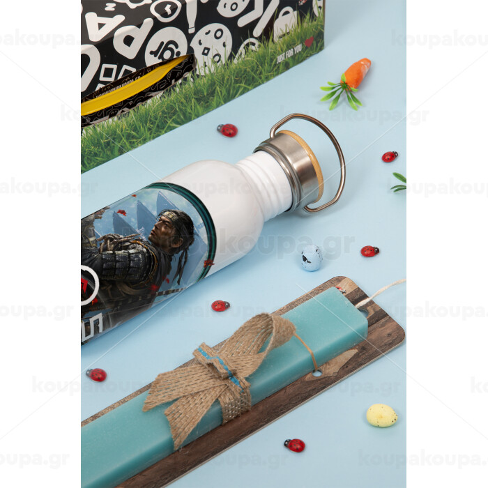 Ghost of Tsushima, Easter Set, metallic silver aluminum water bottle (500ml) & scented flat Easter candle (30cm) (TURQUOISE)