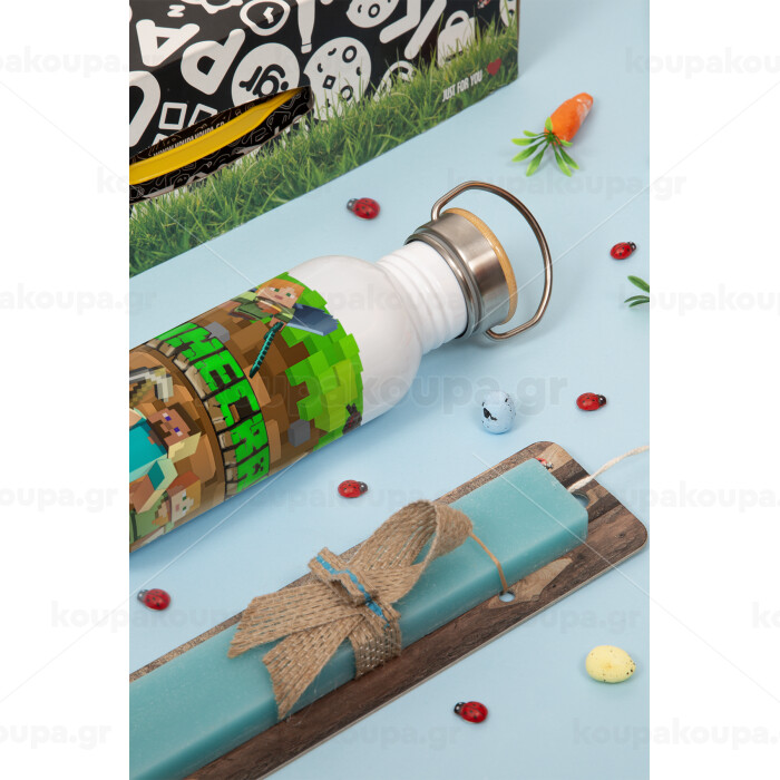 Minecraft characters, Easter Set, metallic silver aluminum water bottle (500ml) & scented flat Easter candle (30cm) (TURQUOISE)