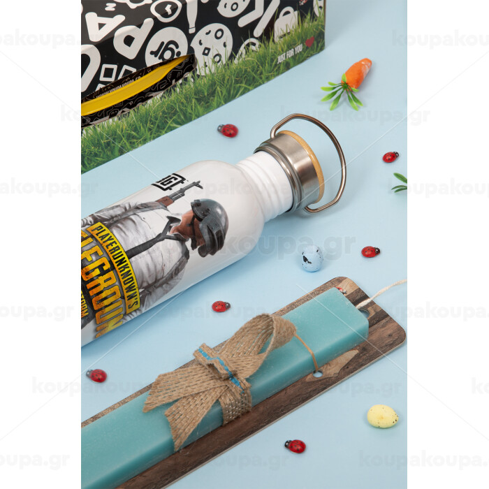 PUBG battleground royale, Easter Set, metallic silver aluminum water bottle (500ml) & scented flat Easter candle (30cm) (TURQUOISE)