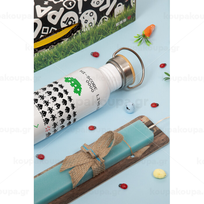 Space invaders, Easter Set, metallic silver aluminum water bottle (500ml) & scented flat Easter candle (30cm) (TURQUOISE)