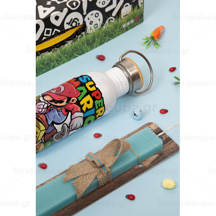 Super mario Jump, Easter Set, metallic silver aluminum water bottle (500ml) & scented flat Easter candle (30cm) (TURQUOISE)