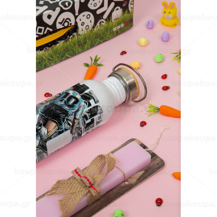 Diego Maradona (Ντιέγκο Μαραντόνα), Easter Set, SS Metallic water bottle (620ml, stainless steel) & scented flat Easter candle (30cm) (PINK)