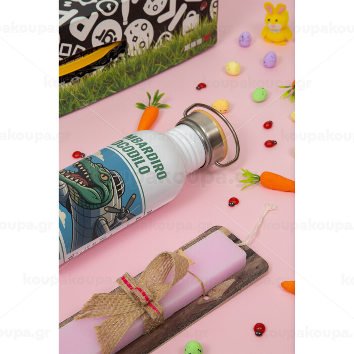 Bombardiro Crocodilo, Easter Set, SS Metallic water bottle (620ml, stainless steel) & scented flat Easter candle (30cm) (PINK)