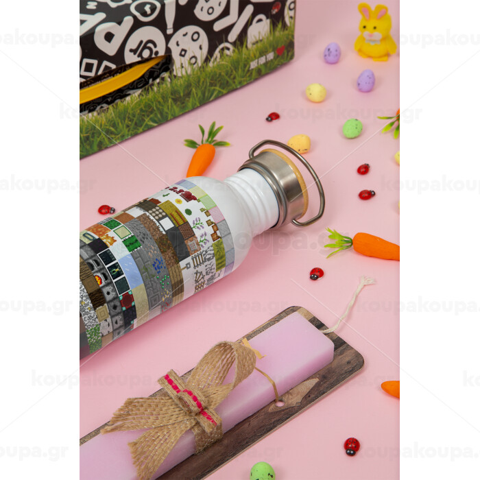 Minecraft blocks, Easter Set, SS Metallic water bottle (620ml, stainless steel) & scented flat Easter candle (30cm) (PINK)