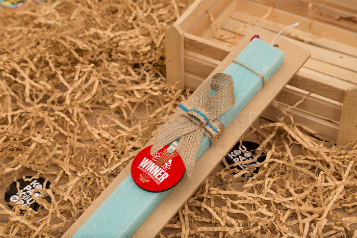 Europa Conference League WINNER, Easter Set, wooden keychain & aromatic flat Easter candle (30cm) (TURQUOISE)