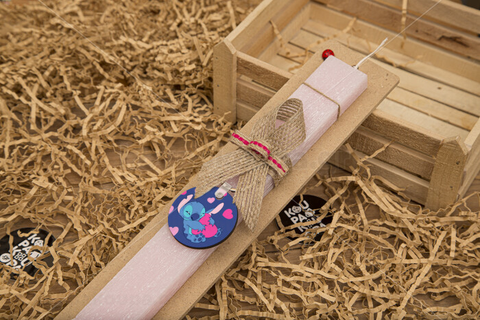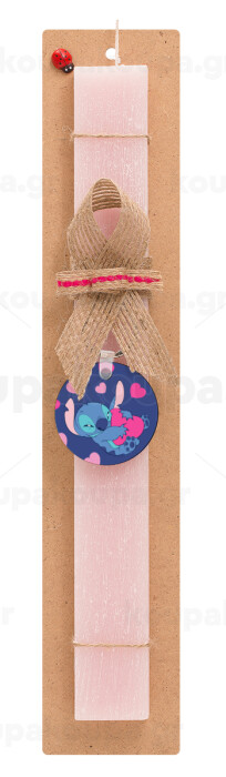 Lilo & Stitch hugs and hearts, Easter Set, wooden keychain & scented flat Easter candle (30cm) (PINK)
