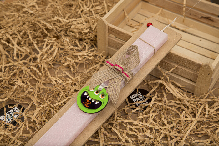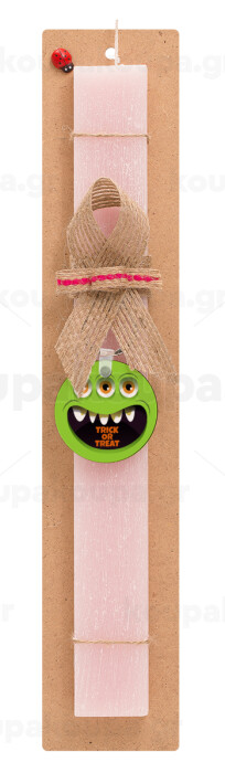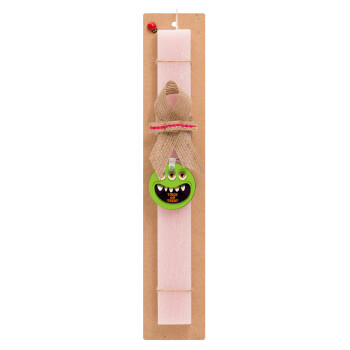 Halloween trick or treat 3 eyes monster, Easter Set, wooden keychain & scented flat Easter candle (30cm) (PINK)