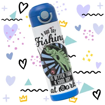 A bad day FISHING is better than a good day at work, Easter candle, Childrens hot water bottle, stainless steel, with safety straw, BLUE (500ml)