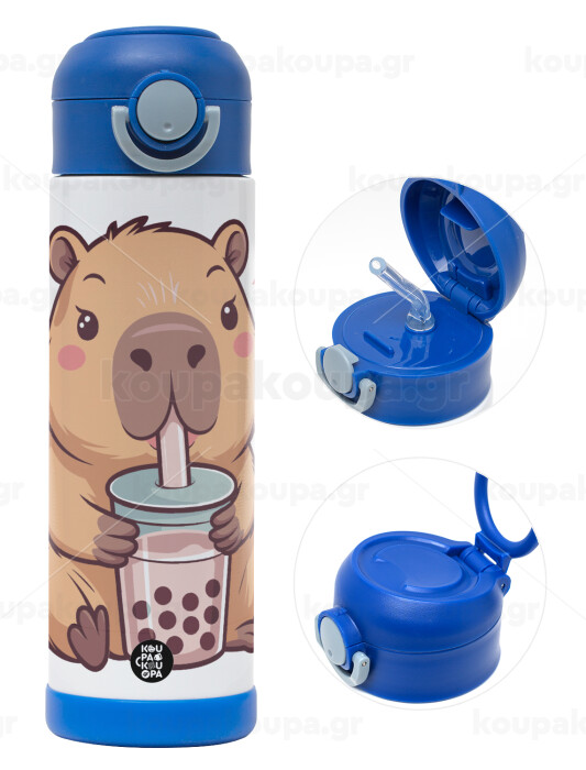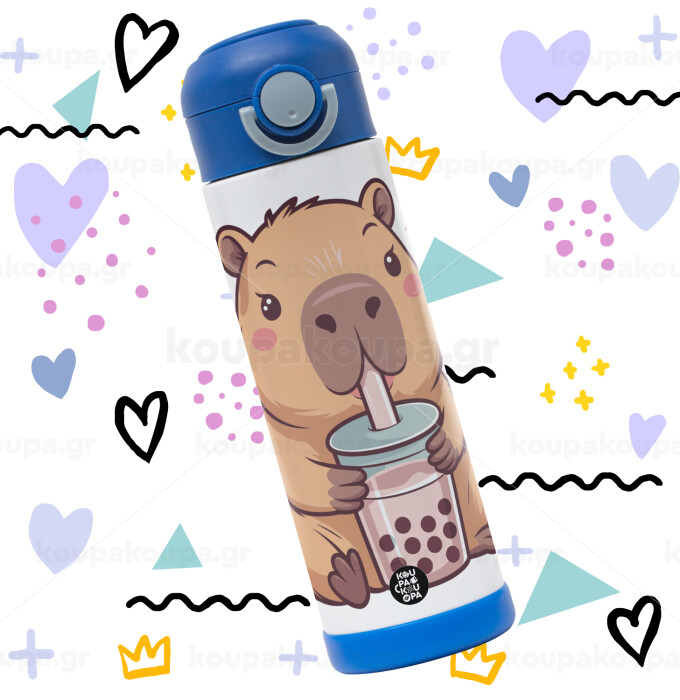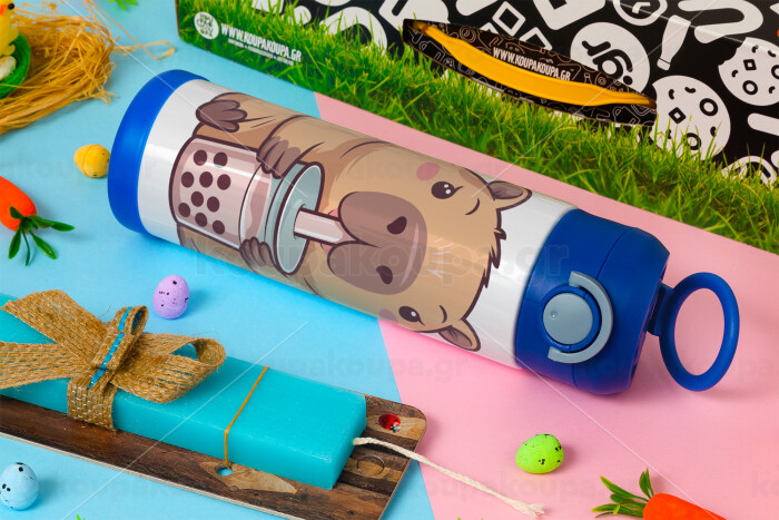 Capybara Bubble Tea, Easter candle, Childrens hot water bottle, stainless steel, with safety straw, BLUE (500ml)