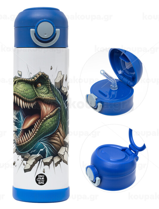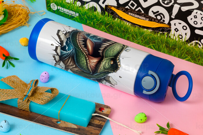 Dinosaur break wall, Easter candle, Childrens hot water bottle, stainless steel, with safety straw, BLUE (500ml)
