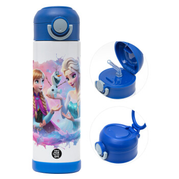 Elsa & Anna Princess, Easter candle, Childrens hot water bottle, stainless steel, with safety straw, BLUE (500ml)