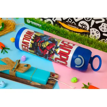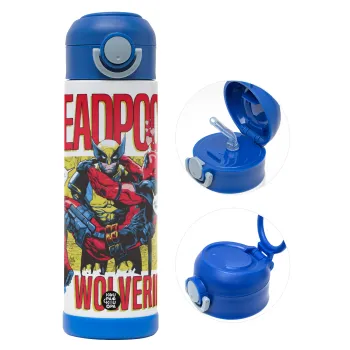 Superhero Deadpool Wolverine, Easter candle, Childrens hot water bottle, stainless steel, with safety straw, BLUE (500ml)