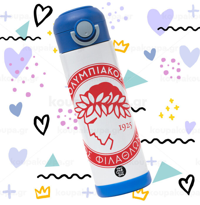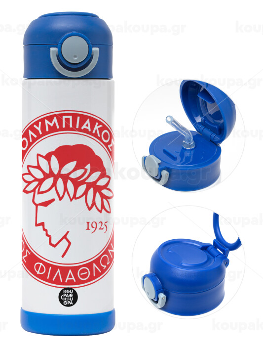 Ολυμπιακός, Easter candle, Childrens hot water bottle, stainless steel, with safety straw, BLUE (500ml)