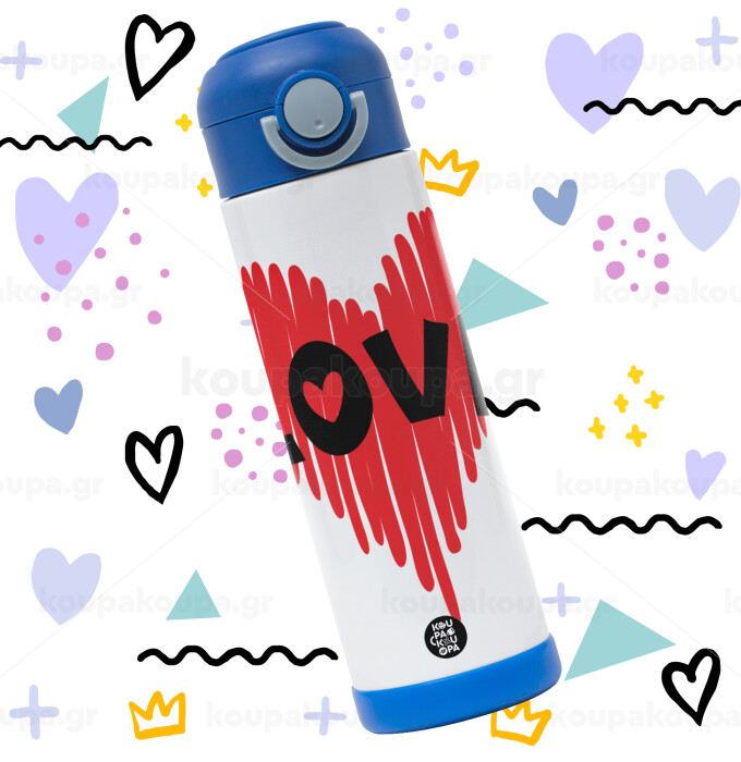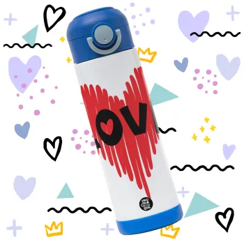 I Love You red heart, Easter candle, Childrens hot water bottle, stainless steel, with safety straw, BLUE (500ml)