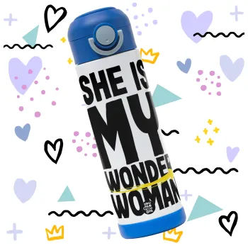 She is my wonder woman, Easter candle, Childrens hot water bottle, stainless steel, with safety straw, BLUE (500ml)
