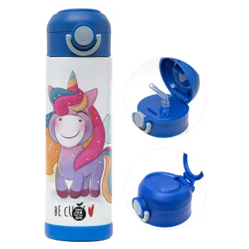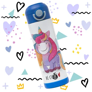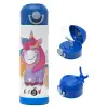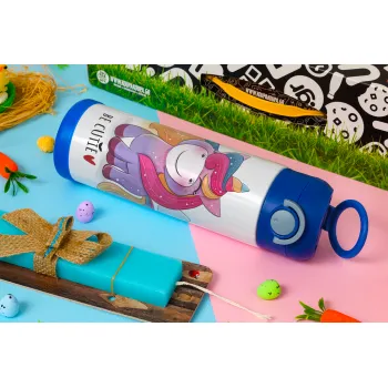 Pink unicorn, Easter candle, Childrens hot water bottle, stainless steel, with safety straw, BLUE (500ml)