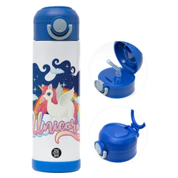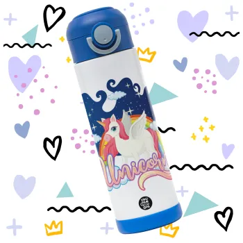 Μονόκερος, Easter candle, Childrens hot water bottle, stainless steel, with safety straw, BLUE (500ml)