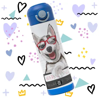 Warning, beware of Dog, Easter candle, Childrens hot water bottle, stainless steel, with safety straw, BLUE (500ml)