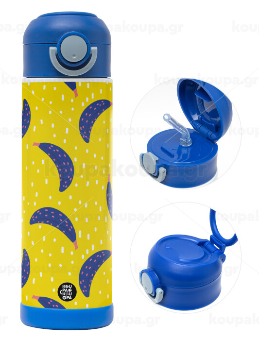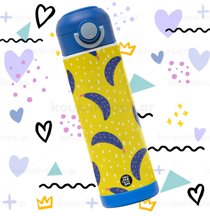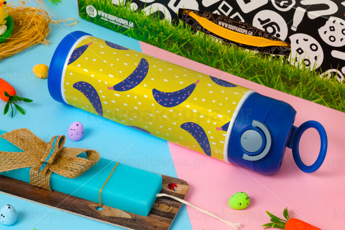 Yellow seamless with blue bananas, Easter candle, Childrens hot water bottle, stainless steel, with safety straw, BLUE (500ml)