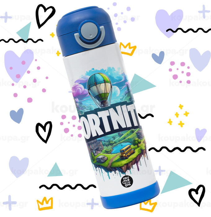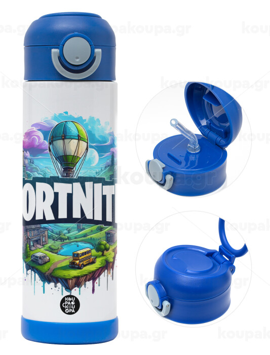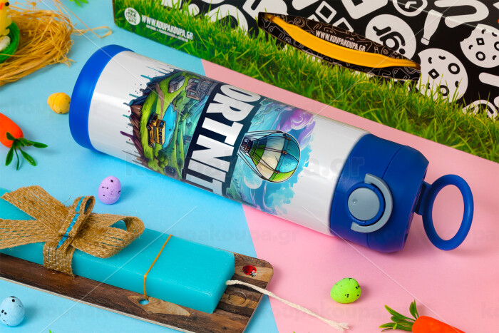 Fortnite land, Easter candle, Childrens hot water bottle, stainless steel, with safety straw, BLUE (500ml)
