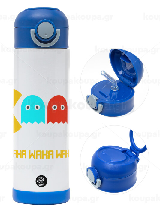 Pacman waka waka waka, Easter candle, Childrens hot water bottle, stainless steel, with safety straw, BLUE (500ml)