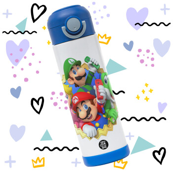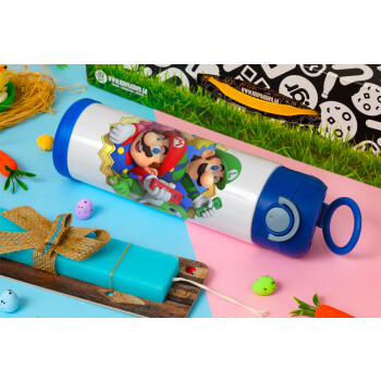 Super mario and Friends, Easter candle, Childrens hot water bottle, stainless steel, with safety straw, BLUE (500ml)