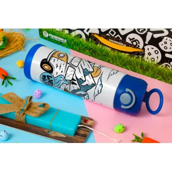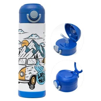 Life is a trip, Easter candle, Childrens hot water bottle, stainless steel, with safety straw, BLUE (500ml)