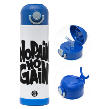 No pain no gain, Easter candle, Childrens hot water bottle, stainless steel, with safety straw, BLUE (500ml)