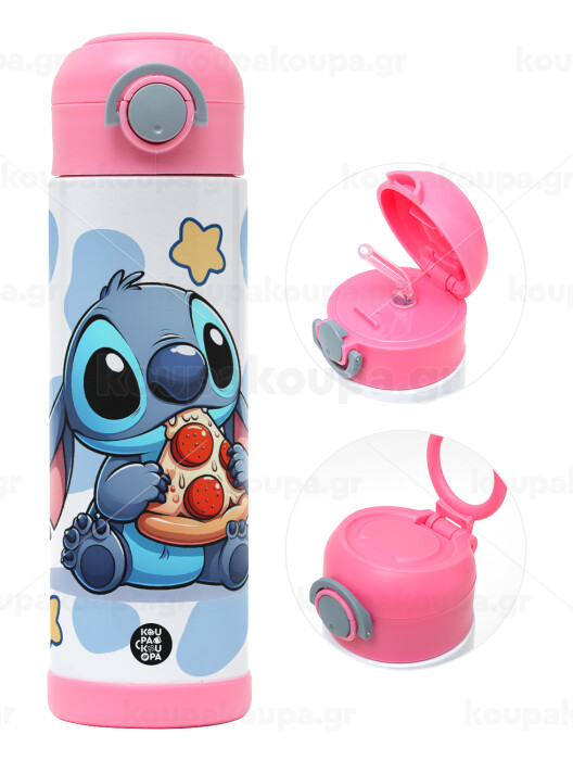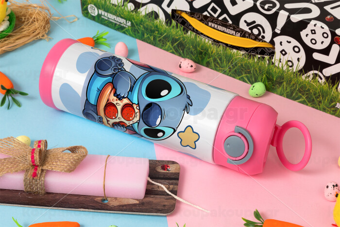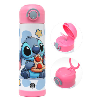 Stitch Pizza, Easter candle, Childrens hot water bottle, stainless steel, with safety straw, PINK (500ml)