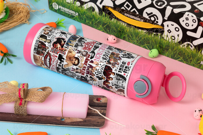 Maneskin stickers, Easter candle, Childrens hot water bottle, stainless steel, with safety straw, PINK (500ml)