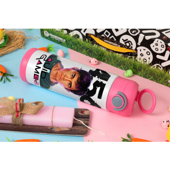 Squid game 456 Gi-Hun, Easter candle, Childrens hot water bottle, stainless steel, with safety straw, PINK (500ml)