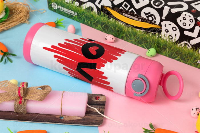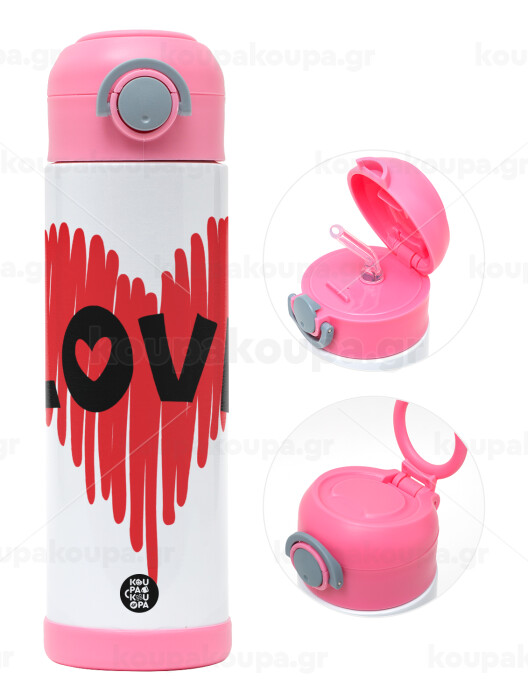 I Love You red heart, Easter candle, Childrens hot water bottle, stainless steel, with safety straw, PINK (500ml)