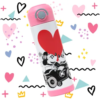 Mickey & Minnie love car, Easter candle, Childrens hot water bottle, stainless steel, with safety straw, PINK (500ml)