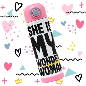 She is my wonder woman, Easter candle, Childrens hot water bottle, stainless steel, with safety straw, PINK (500ml)