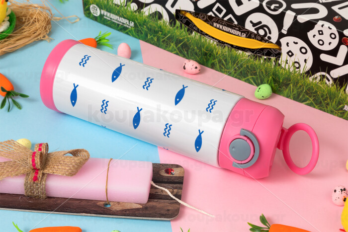 Fishing, Easter candle, Childrens hot water bottle, stainless steel, with safety straw, PINK (500ml)
