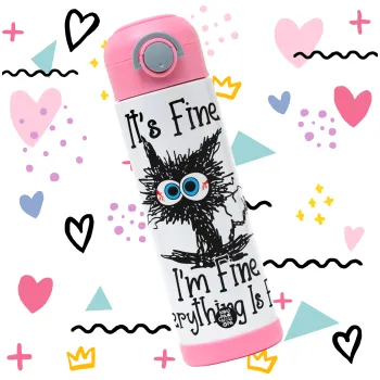 Cat, It's Fine I'm Fine Everything Is Fine, Easter candle, Childrens hot water bottle, stainless steel, with safety straw, PINK (500ml)