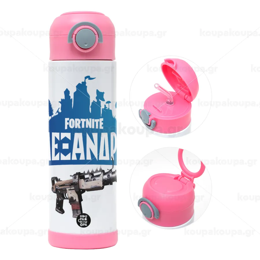 Fortnite with gun με το όνομα σου, Easter candle, Childrens hot water bottle, stainless steel, with safety straw, PINK (500ml)
