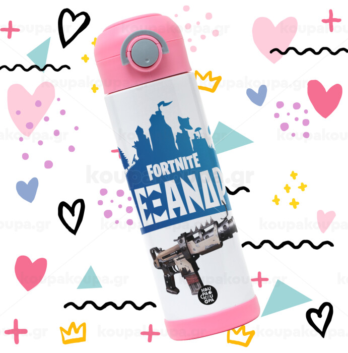 Fortnite with gun με το όνομα σου, Easter candle, Childrens hot water bottle, stainless steel, with safety straw, PINK (500ml)