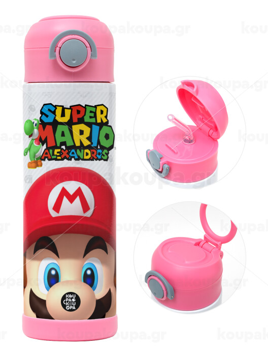 Super mario head, Easter candle, Childrens hot water bottle, stainless steel, with safety straw, PINK (500ml)