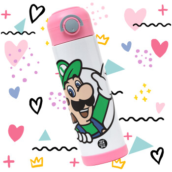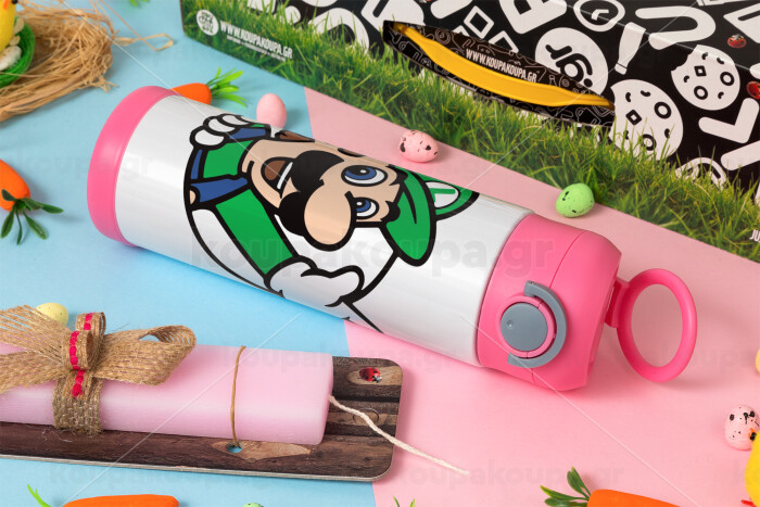 Super mario Luigi win, Easter candle, Childrens hot water bottle, stainless steel, with safety straw, PINK (500ml)