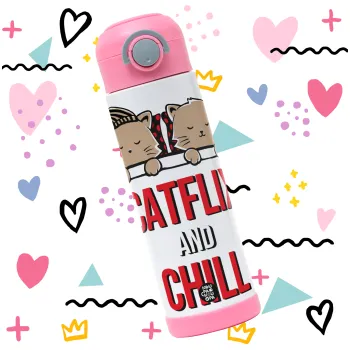 Catflix and Chill, Easter candle, Childrens hot water bottle, stainless steel, with safety straw, PINK (500ml)