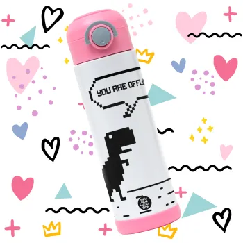 You are offline dinosaur, Easter candle, Childrens hot water bottle, stainless steel, with safety straw, PINK (500ml)