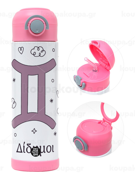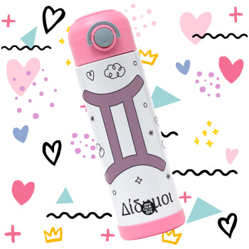 Ζώδια Δίδυμοι, Easter candle, Childrens hot water bottle, stainless steel, with safety straw, PINK (500ml)