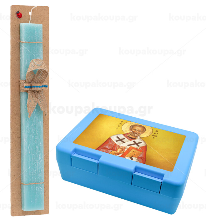 Saint Nicholas orthodox , Easter Set, children's snack container BLUE & Easter aromatic flat candle (30cm) (TURQUOISE)