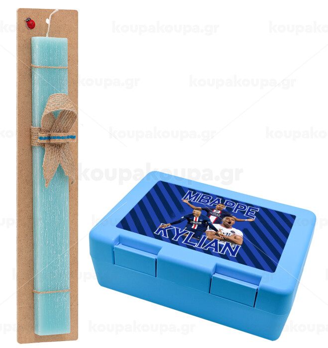 Kylian Mbappé, Easter Set, children's snack container BLUE & Easter aromatic flat candle (30cm) (TURQUOISE)