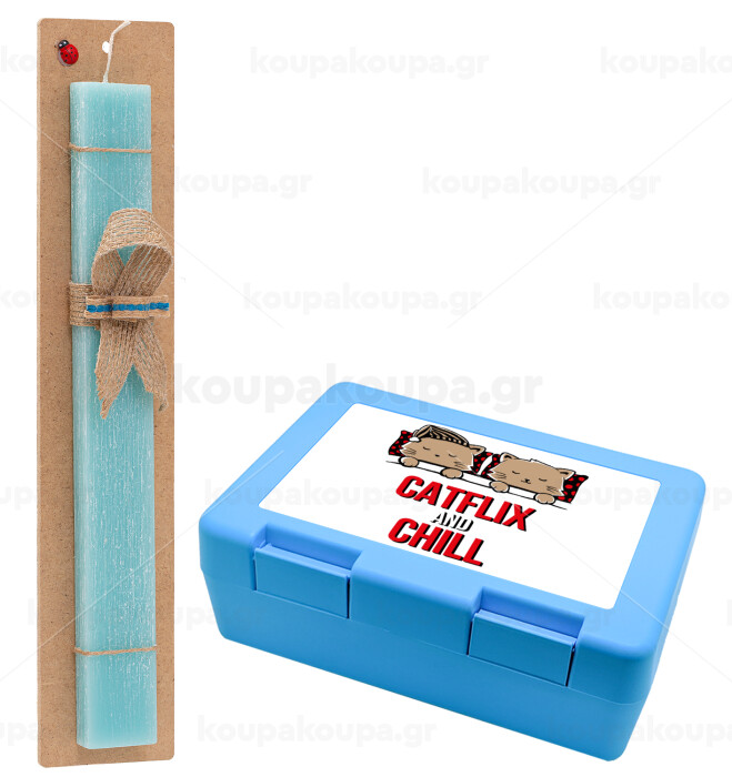 Catflix and Chill, Easter Set, children's snack container BLUE & Easter aromatic flat candle (30cm) (TURQUOISE)