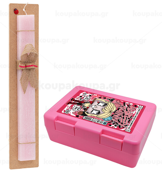Harley Quinn (Χάρλεϊ Κουίν), Easter Set, children's snack container PINK & scented flat Easter candle (30cm) (PINK)