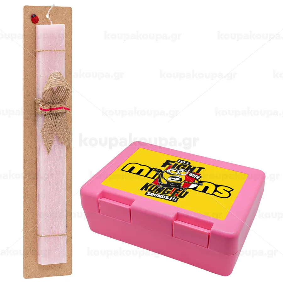 Minions Let's fight with kung fu sounds, Easter Set, children's snack container PINK & scented flat Easter candle (30cm) (PINK)