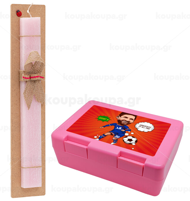 Lionel Messi drawing, Easter Set, children's snack container PINK & scented flat Easter candle (30cm) (PINK)