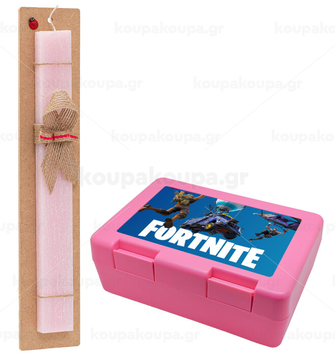 Fortnite Bus, Easter Set, children's snack container PINK & scented flat Easter candle (30cm) (PINK)